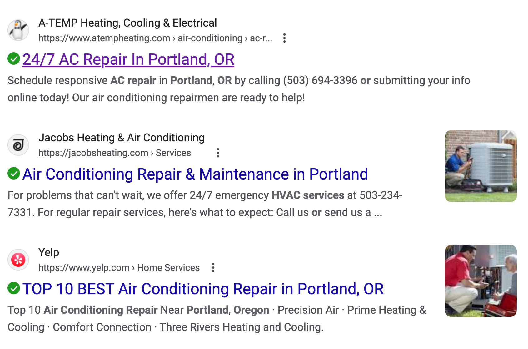 The primary keyword for this page was "ac repair in portland oregon". Type the keyword into Google, and you get the following ORGANIC result: